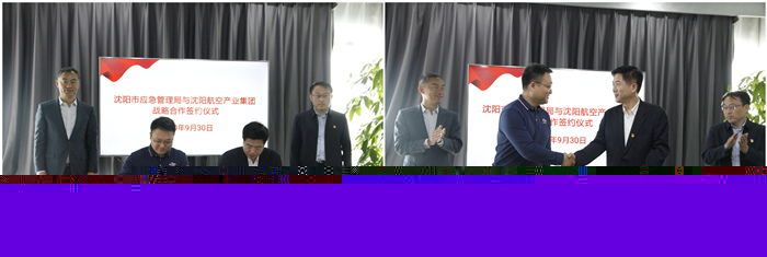 9月30日上午,沈陽航空產(chǎn)業(yè)集團(tuán)與沈陽市應(yīng)急管理局在集團(tuán)投資公司總部舉行戰(zhàn)略合作協(xié)議簽署和“沈陽航空應(yīng)急救援產(chǎn)業(yè)基地”揭牌儀式。沈陽市應(yīng)急管理局黨委書記、局長王曉剛,黨委委員、副局長樸強(qiáng),救援協(xié)調(diào)和預(yù)案管理處處長王季勝,航空集團(tuán)黨委副書記、總經(jīng)理吳波,集團(tuán)副總經(jīng)理劉海濤、集團(tuán)招商中心主任盛偉英,沈陽通航產(chǎn)業(yè)發(fā)展有限公司董事長王昌生、副總經(jīng)理劉璐、辦公室主任姜永慧出席了簽約儀式。集團(tuán)副總經(jīng)理劉海濤主持簽約儀式。